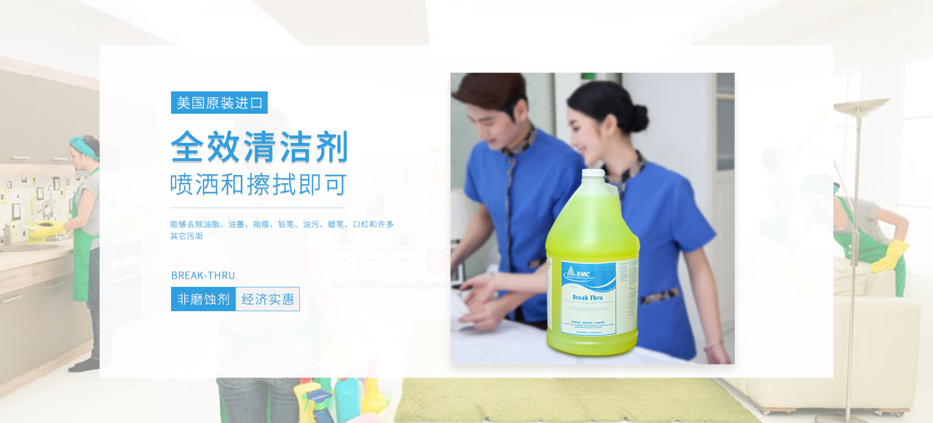 新朗環(huán)境自2015年起與美國具百年歷史的跨國企業(yè)RMC(Rochester Midland Corporation)合作, 進(jìn)口 RMC用于機(jī)械制造、交通運(yùn)輸、航天航空、石油化工、食品禽肉乳制品加工等工業(yè)生產(chǎn)制造行業(yè)的專業(yè)清洗、滅菌系列產(chǎn)品,以及酒店、CBD大廈、學(xué)校(包括幼稚園)、醫(yī)療機(jī)構(gòu)、百貨商場、養(yǎng)殖業(yè)、餐飲業(yè)等商用行業(yè)清潔、消毒系列產(chǎn)品,還有專用于各個行業(yè)單位“廁所革命”的公共衛(wèi)生間根源除味第5代SANOR?衛(wèi)生間自動滴管系統(tǒng)、第6代百屋潔SIOGIENIUS?電子控制衛(wèi)生間自動滴注系統(tǒng)等系列產(chǎn)品項(xiàng)目。